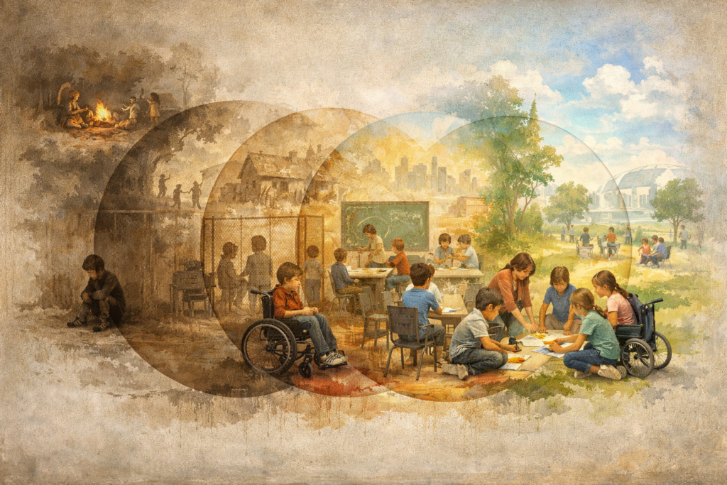 Il y a une narrative qui circule dans les milieux de l’éducation spécialisée et des politiques sociales, une narrative si bien rodée qu’elle finit par ressembler à une loi naturelle : l’histoire irait de l’exclusion vers la ségrégation, puis vers l’intégration, puis vers l’inclusion. Quatre étapes, un sens de marche. Comme si l’humanité se réveillait progressivement de sa propre cruauté, et que nous nous trouvions, chanceux, vers la fin du mauvais rêve.