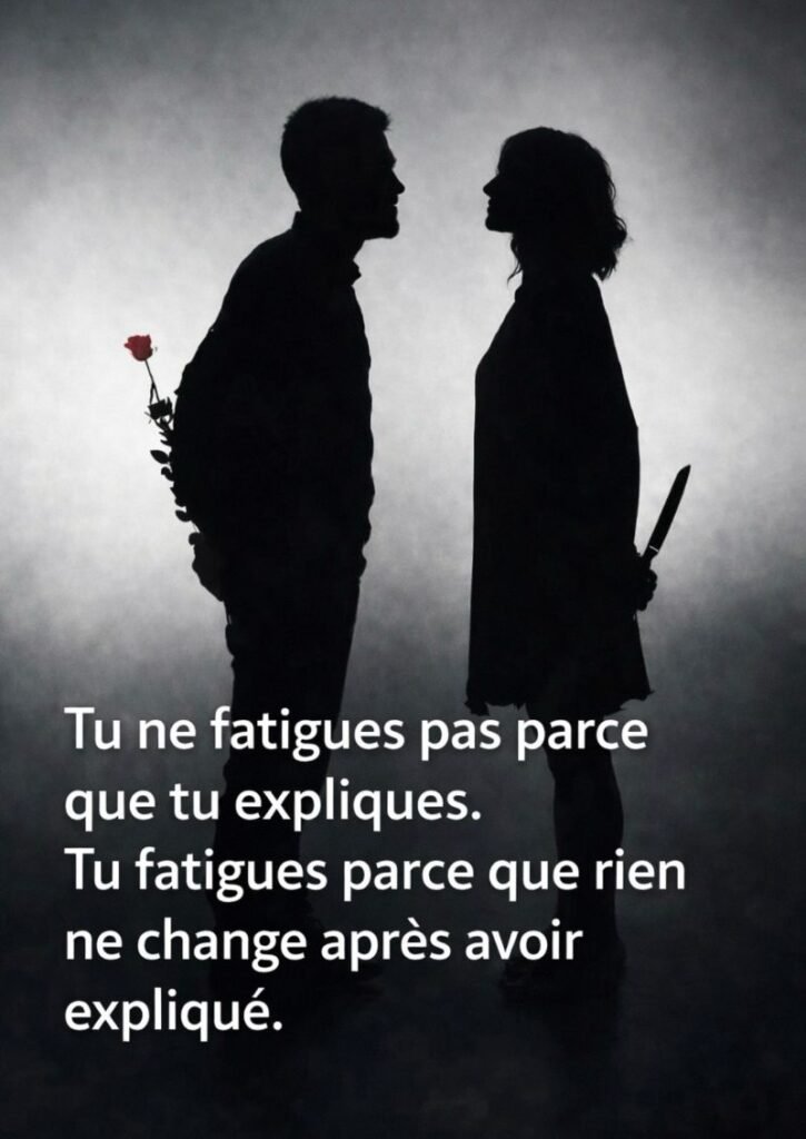 Il y a cette image que je n’arrive pas à regarder sans malaise. Deux silhouettes dans une lumière de brume : un homme avec une rose cachée dans le dos, une femme avec un couteau dans la main. Ils se regardent. Aucun ne voit ce que l’autre porte. En bas : Tu ne fatigues pas parce que tu expliques. Tu fatigues parce que rien ne change après avoir expliqué.