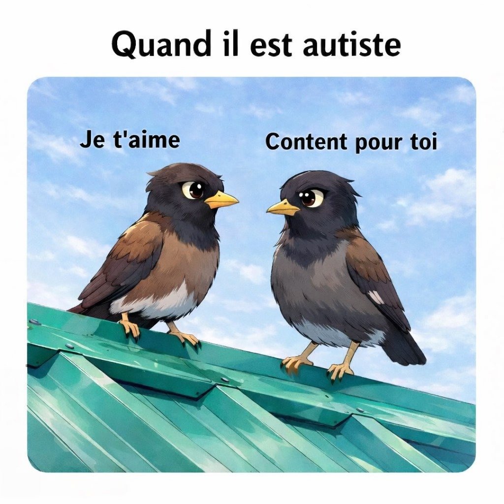 Il y a des silences qui ne sont pas du retrait. Des absences de mots qui ne sont pas des absences de sentiment. Quand elle lui a dit je t’aime, et qu’il a répondu content pour toi – non par cruauté, non par indifférence, mais parce que le circuit entre l’éprouvé et l’exprimable est, chez lui, câblé autrement -, quelque chose s’est fissuré dans la pièce. Pas en lui. En elle.