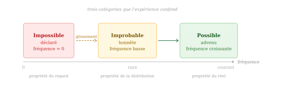 L’improbable, lui, est honnête. Il reconnaît qu’il travaille avec des distributions, des fréquences, des histoires passées. Il dit : jusqu’ici, rarement – et dans ce jusqu’ici se glisse toute la porosité du temps. L’improbable tremble. L’impossible, non. Il est calcifié.