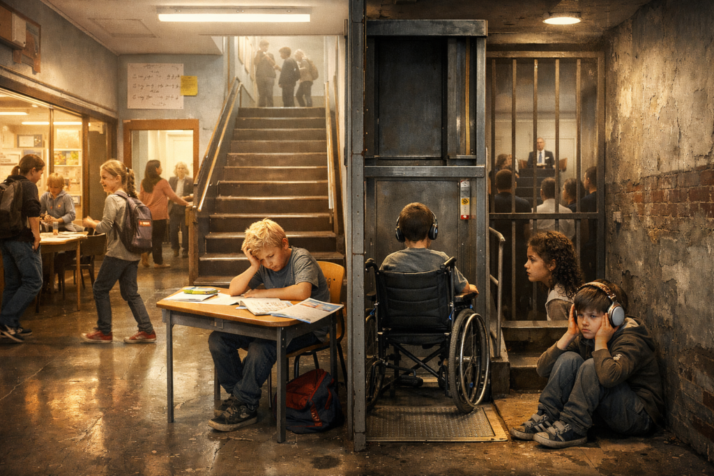 Imaginez un bâtiment entièrement construit en escaliers. On décide d’y « inclure » les personnes en fauteuil en installant un monte-charge à l’entrée de service. Techniquement, elles peuvent entrer. Le bâtiment, lui, n’a pas bougé d’un centimètre. Et tout le monde fait semblant de ne pas voir la différence.